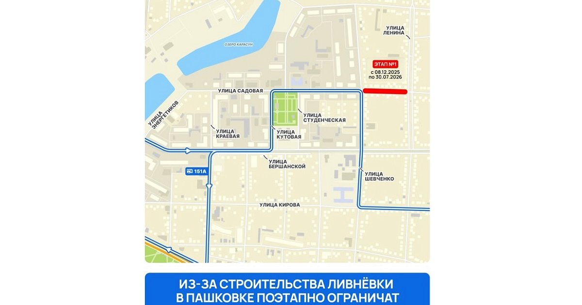 На первом этапе с 8 декабря перекроют участок улицы Садовой от улицы Ленина до Шевченко — движение автобусов останется без изменений. Далее, начиная с 3 января, до 15 июня 2026 года, ограничения будут вводиться на разных участках улиц Садовой и Шевченко, сопровождаясь временными объездами и изменениями схем маршрутов автобусов.