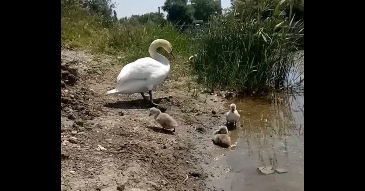 Сегодня в социальных сетях появилось видео, снятое местным жителем в Анапе на берегу реки Анапки. На опубликованных кадрах запечатлены лебедь и три птенца. Пернатые крохи сушили и вычищали перья после купания в водоеме.
